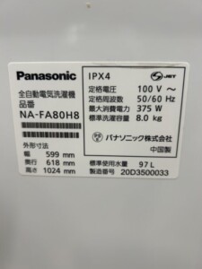 埼玉県桶川市へパナソニック NA-FA80H8 全自動洗濯機 きれいな状態のため適正価格で査定しました