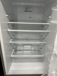 冷蔵庫の庫内は棚板・ドアポケットともに欠品はなく食品のニオイ残りやベタつき等も少なく清潔な状態でした。外装はシルバーカラー特有の擦れ傷が一部にある程度で、目立つ大きなヘコミや割れは確認されていません。冷蔵・冷凍ともに冷え具合を確認しましたが、動作も安定していました。