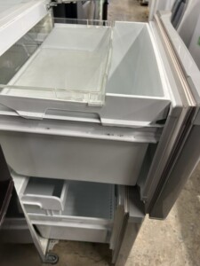 お預かりした冷蔵庫は2015年製で、外装には細かなキズや使用に伴うスレが見られましたが、冷蔵・冷凍ともにしっかり冷え、異音や水漏れなどの不具合はありませんでした。庫内も清掃されており、棚板やドアポケットなどの付属パーツも揃っている状態でした。