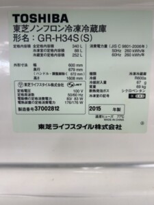 今回は埼玉県秩父市にお住まいの50代女性(主婦・高齢世帯・持ち家(一戸建て))より、東芝 ノンフロン冷凍冷蔵庫 GR-H34S(S)(2015年製)を出張買取にてご依頼いただきました。