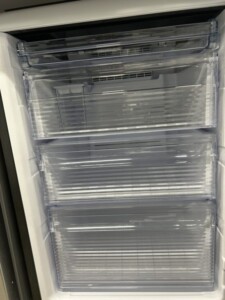 設置から数年経過している冷蔵庫でしたが、外装に大きなヘコミはなく、庫内も定期的にお手入れされていたため清潔感のある状態でした。冷蔵・冷凍ともにしっかり冷えており、異音や水漏れなどの不具合は確認されませんでした。棚板やドアポケットなどの付属パーツも揃っていました。