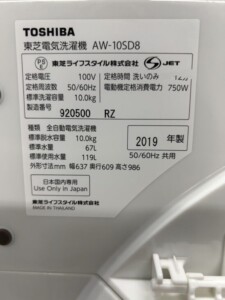埼玉県吉川市 東芝 AW-10SD8 全自動洗濯機 2019年製 使用感ありのため状態を考慮して査定しました