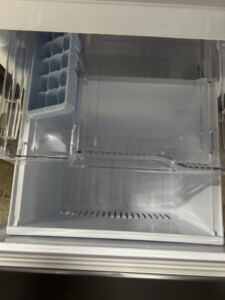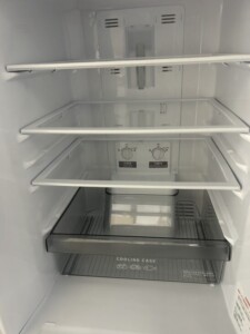 拝見した冷蔵庫は扉の塗装に目立つスレやへこみはなく、シルバーグレーの外観も均一で清潔感がありました。庫内のガラス棚やドアポケットに欠けは見られず、冷蔵室・冷凍室ともにニオイや着色汚れが少ない状態でした。温度調節ダイヤルも正常に動作し、冷却機能に問題はありませんでした。