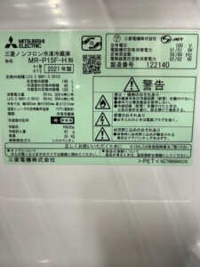 山梨県甲斐市へ三菱 MR-P15F-H 冷凍冷蔵庫 2021年製 外装きれいな状態のため適正価格で査定しました