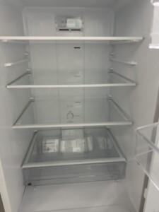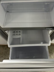 庫内は棚板やクリアケースなどの付属パーツがすべて揃っており、汚れやニオイも少なく全体的にきれいな印象でした。冷蔵・冷凍ともに冷え具合を確認し、動作に問題はありません。一方で、正面のステンレス調パネルには小さな凹みと細かな擦りキズが見受けられました。
