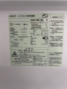 今回は山口県下関市にお住まいの30代女性(主婦・親子世帯・持ち家(一戸建て))より、AQUA ノンフロン冷凍冷蔵庫 AQR-20K(S)(2021年製)を出張買取にてご依頼いただきました。