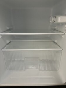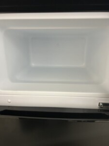 拝見した本体は外装のブラック塗装に目立つへこみや大きなキズはなく、天板・扉ともに光沢が保たれていました。庫内は棚板や冷蔵ケースに割れがなく、冷蔵室・冷凍室ともに清掃が行き届いた状態で、食品臭も感じられませんでした。温度調節ダイヤルの反応も良好で、動作確認でも冷却に問題はありませんでした。
