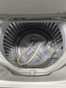 外観はホワイトカラーのボディに目立つヘコミや割れはなく、操作パネルやフタ部分も比較的きれいな状態でした。槽内も強いカビ汚れやサビは見られず、給水ホースなどの付属品も揃っていました。動作確認では洗い・すすぎ・脱水・乾燥まで問題なく稼働することを確認できました。