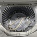 外観はホワイトカラーのボディに目立つヘコミや割れはなく、操作パネルやフタ部分も比較的きれいな状態でした。槽内も強いカビ汚れやサビは見られず、給水ホースなどの付属品も揃っていました。動作確認では洗い・すすぎ・脱水・乾燥まで問題なく稼働することを確認できました。
