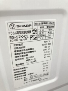 SHARPのES-S7Kシリーズは、洗濯7kgクラスで設置性がよく、単身~二人暮らしの需要が安定しています。とくに今回は2025年製と新しめで、外装ダメージが少なく、付属品も揃っていたため、再販時にマイナス要因が出にくい点を評価しました。