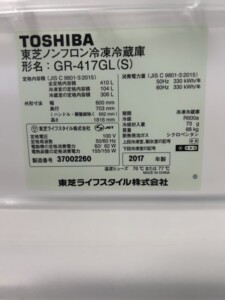 今回は秋田県大仙市にお住まいの30代主婦のお客様より東芝冷蔵庫GR-417GL(S)(2017年製)を出張買取にてご依頼いただきました。一軒家へ引越しが決まり、家電を新調される事となり古い大型冷蔵庫のお買取のご依頼を頂きました。
