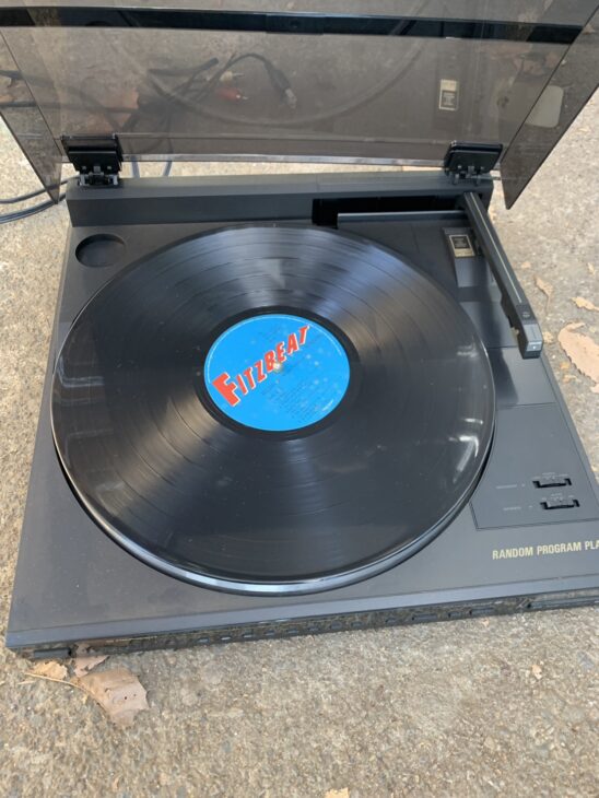 本体天面のダストカバーには保管に伴うスレや細かなキズ、くすみが見られましたが、大きな割れや破損は確認されませんでした。内部のターンテーブル部分やアーム周りも目立つ欠損はなく、背面の接続ケーブルも揃っている状態でした。全体としては年式相応の使用感はあるものの、リニアトラッキング方式という特徴的な構造を持つモデルとして再販が見込める状態でした。