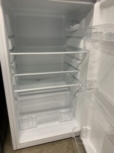 実際に拝見したところ、外装正面には使用に伴うスレや薄いキズが確認できました。ただし大きな凹みや構造に影響する破損はなく、全体としては使用に支障のない印象でした。庫内についてはトレイ・棚板・ドアポケット類が揃っており、大きな黄ばみやにおい残りも少なく、清潔感のある状態でした。冷凍室にもひどい霜だまりはなく、日常的に丁寧に使用されていたことが伺える個体でした。