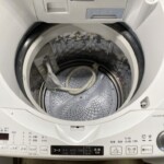拝見したES-TX8E-Wは、天面・操作部ともに目立つ割れや大きなへこみはなく、全体として清潔感のある外観でした。洗濯槽内も写真のとおり強い汚れやサビの付着は見受けられず、フタ周りも大きな傷みはありません。付属品は給水ホースが確認でき、一般的な設置環境で使われていた印象です。動作については、通電のうえ表示・各ボタン反応を確認し、異音や焦げ臭さなどの懸念がないことをチェックしました。