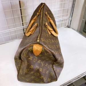 お買取したバックのスピーディ30は、表面のモノグラムキャンバスに大きな破れはなく、型崩れも比較的少ない状態でしたが、ハンドルやファスナー周辺のヌメ革には全体的なヤケと色の濃淡が見られ、底面のレザー部分にも擦れが確認できました。内部には薄い汚れがありましたが、強いベタつきや破れはなく、ファスナーの開閉も問題ありませんでした。