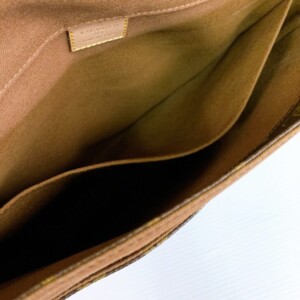お買取したルイヴィトン・ヴァルミーMMは、外側のモノグラムキャンバスに大きな破れはなく、全体の型崩れも比較的少ない状態でしたが、ショルダーストラップやパイピング部分のヌメ革には濃いヤケとスレがあり、内側ポケットには経年による生地の劣化が見受けられました。ファスナーの開閉自体は問題なく、実用には支障のないコンディションです。