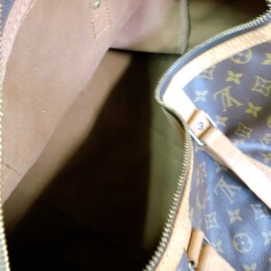 お預かりしたスピーディ30は、モノグラムキャンバス部分に破れや剥がれは見られず、柄の発色も良好でしたが、持ち手やファスナー周りのヌメ革には色ヤケや細かな擦れがあり、内側のライニングには長年の使用による薄い汚れや小さなシミが確認できました。ファスナーの開閉は問題なく、金具部分にはくすみがあるものの機能面に支障はありませんでした。