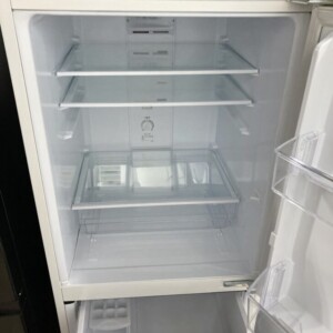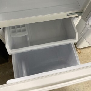 ホワイトカラーの本体で、扉や側面に使用に伴う細かなスレや軽い汚れが確認できましたが、目立つへこみや破損はありませんでした。庫内は棚板・ケースともに揃っており、大きな変色や臭いは感じられない状態です。通電確認では冷蔵・冷凍ともにしっかりと冷却しており、日常使用に問題はありませんでした。