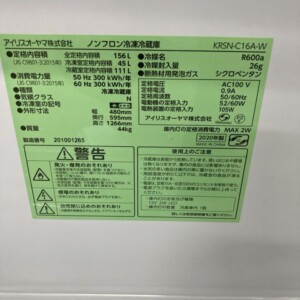 大阪府松原市にてアイリスオーヤマ ノンフロン冷凍冷蔵庫 KRSN-C16A-W 2020年製 美品のため適正価格で査定しました