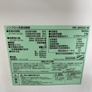 大阪府羽曳野市にてノンフロン冷凍冷蔵庫 PRC-B092D-W 2024年製 美品のため適正価格で査定しました