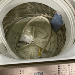 お預かりした洗濯機は、外装に細かな擦れや使用に伴うくすみが見られましたが、フタの開閉や各ボタンの反応は問題なく、槽内も目立つ汚れやカビは確認されない状態でした。給水ホース・排水ホースなどの付属品も揃っており、洗い・すすぎ・脱水の各工程が正常に動作することを確認しています。
