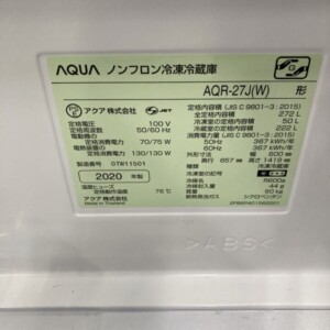今回は宇佐市にお住まいの40代女性のお客様より、AQUA ノンフロン冷凍冷蔵庫 AQR-27J(W)(2020年製)を出張買取にてご依頼いただきました。容量は272Lの3ドアタイプで、冷蔵・冷凍ともに使いやすい設計のモデルです。