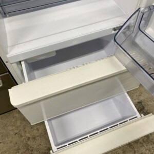庫内の棚やドアポケットに大きな割れや欠けは見られず、冷蔵室・冷凍室ともに清潔感のある状態でした。外観も正面・側面に目立つへこみや深い擦れはなく、実使用に伴う軽微なスレ程度に留まっています。製氷トレーや引き出しケースも揃っており、動作確認でも冷却性能に問題はありませんでした。