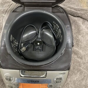 動作確認は問題ありませんでしたが、外装全体に擦れや塗装の剥がれ、細かな傷が多数見受けられました。内側にもコーティングの摩耗や傷があり、日常使用による消耗がはっきりと分かる状態です。電源コードは付属しており、基本的な炊飯機能は正常に動作していました。