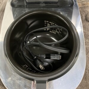 外装には細かな擦れや汚れが複数見受けられ、内装にも使用に伴う小傷やくすみが確認できました。内鍋にもコーティングの一部に軽い摩耗や小傷があり、全体的に使用感のある状態です。電源を入れての基本動作は問題なく確認できました。