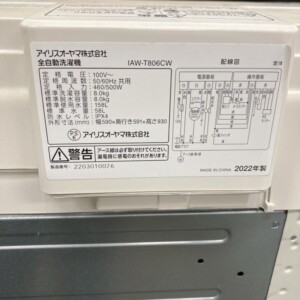 長崎県壱岐市 アイリスオーヤマ IAW-T806CW 全自動洗濯機 2022年製 美品のため高価買取しました