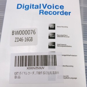 お預かりしたQZTのボイスレコーダーは外箱の封が切られていない未開封の新品状態でした。パッケージから、ステレオ録音対応、MP3およびWMA形式での保存、16GBの内蔵メモリ、USBメモリとしても利用可能な点を確認しました。箱の角潰れや汚れもほとんどなく、保管状態の良さが査定評価を高めるポイントとなりました。