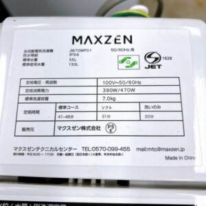 JW70WP01は洗濯容量7.0kgと単身世帯からの需要が高く、状態も良好で再販しやすいモデルです。当社ではMAXZEN製品の取扱実績が多く、整備から販売までの工程を自社で完結できる体制があるため、一般的なリサイクルショップよりも高い価格をご提示できました。これらを踏まえ、今回は2,500円での買取価格となりました。