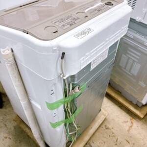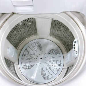 外観は天面や側面に通常使用による細かな擦れや薄い汚れが見られましたが、フタや操作パネルに割れはなく、洗濯槽内部もサビや強い黒カビの付着は確認されませんでした。パルセーターや糸くずフィルターも揃っており、給水ホース・排水ホースなどの付属品も一式確認できました。通電後の動作確認では、洗い・すすぎ・脱水の各工程が問題なく作動しており、再販に支障のない状態でした。