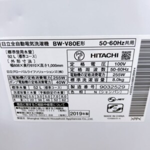 今回は小平市内の賃貸アパートにお住まいの30代男性・会社員・単身世帯のお客様より、日立 全自動電気洗濯機 BW-V80E形(2019年製・洗濯容量8.0kg)を出張買取にてご依頼いただきました。