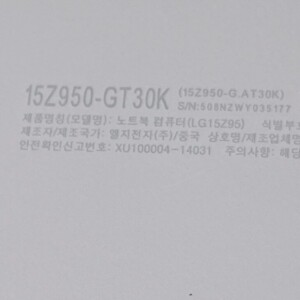 お預かりした15Z950-GT30Kは、天板や底面に細かな擦れや薄い汚れが見受けられましたが、液晶表示は良好でドット抜けや大きなキズは確認されませんでした。キーボードの文字消えも少なく、タッチパッドの反応も問題ありません。通電および基本動作を確認し、Intel Core i3搭載モデルとして十分に実用できる状態でした。ACアダプターも付属しています。