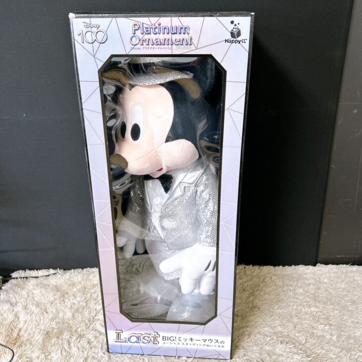 今回は東京都八王子市にお住まいの30代女性より、ディズニー100 Platinum Ornament 2023 ラストワン賞 BIGミッキーマウス スタンディングぬいぐるみを出張買取にてご依頼いただきました。くじで当選されたものの、飾るスペースが確保できず、そのまま保管されていたとのことです。
