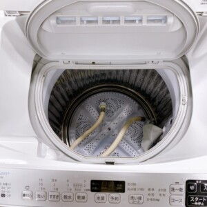 本体外観は大きな割れや破損は見られませんでしたが、天板やフタ部分に軽度の汚れ・使用感が確認できました。槽内についても年式相応の使用感があり、給水ホース・排水ホースは付属していました。動作確認では洗い・脱水・乾燥まで一連の動作は正常でしたが、内部の使用感を考慮する必要がある状態でした。