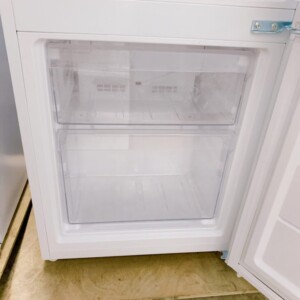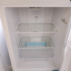 お引き取りしたNTR-140WHは、外観に目立つへこみや大きな傷は見られず、全体的にきれいな状態でした。庫内も棚・ケースともに欠品はなく、ガラス棚に割れやヒビは確認されませんでした。冷蔵室・冷凍室ともに臭い残りや強い汚れはなく、温度調整ダイヤルも正常に反応。通電確認の結果、冷却動作に問題はありませんでした。