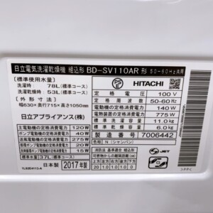 BD-SV110ARは日立の「KAZE IRON BIG DRUM SLIM」シリーズで根強い需要がある一方、2017年製と年式が経過している点が価格に影響しました。それでも洗濯11kg・乾燥6kgの大容量モデルで動作状態が安定していたことから、状態を評価し無料でのお引取りをご提示しました。
