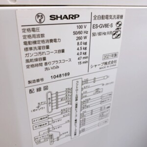 今回は栃木県那須塩原市にお住まいの40代男性・会社員・単身・賃貸(マンション)のお客様より、SHARP(シャープ)全自動電気洗濯機 ES-GV8E-S(2021年製)を出張買取にてご依頼いただきました。標準洗濯容量8.0kgのインバーター搭載モデルで、日常の洗濯を効率よく行える実用性の高い機種です。