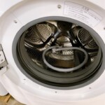 本体外装は目立つキズや大きなへこみが少なく、全体としてはきれいな印象でした。ドア周りのパッキン部にも大きな破れは見られず、ドラム内部も清潔感がありました。一方で、使用に伴う軽微なスレや設置跡が一部確認できたため、コンディションは新品同様ではなく一般的な中古品としての評価となります。給水・排水ホースは揃っており、動作確認では洗い・脱水・乾燥ともに問題なく稼働しました。