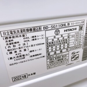 奈良県奈良市にて日立 電気洗濯乾燥機 組込形 BD-SG110HL 2022年製を出張買取|使用感が少ないため適正価格で査定しました