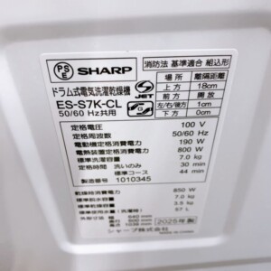 今回は香芝市にお住まいの40代・男性、会社員で単身世帯、賃貸(マンション)にお住まいのお客様より、シャープ ドラム式電気洗濯乾燥機 ES-S7K-CL(2025年製)を出張買取にてご依頼いただきました。