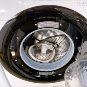 本体外装には目立つへこみや割れはなく、ドアパッキンの劣化も少ない状態でした。ドラム内部は清掃が行き届いており、排水ホースなどの付属品も揃っていました。動作確認では洗い・脱水・乾燥の各工程ともに問題なく稼働し、使用感が比較的少ない印象を受けました。