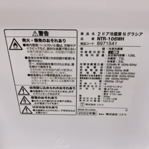 今回は東京都あきる野市にお住まいの40代・女性(主婦/夫婦世帯/持ち家マンション)のお客様より、ニトリ 2ドア冷蔵庫 NTR-106WH(2022年製)を出張買取にてご依頼いただきました。