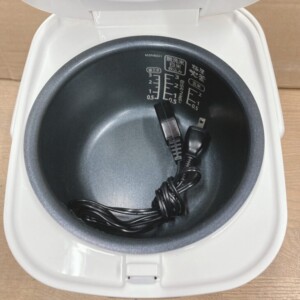 お預かりした炊飯器は、外装に目立つ割れや大きな傷は見られず、全体的に清潔感のある状態でした。操作パネルの表示も正常で、ボタン反応や液晶表示に不具合はありませんでした。内釜についても、コーティングの剥がれや深い傷は確認されず、炊飯目盛りもはっきり残っていました。電源コードが付属しており、通電・加熱動作ともに問題なく確認できています。使用頻度が少ないことがうかがえる状態でした。