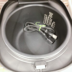 内釜はコーティングの大きな剥がれはなく、目盛りも視認できる状態でした。電源コードも付属しており、通電確認済みです。全体として日常使用に支障のないコンディションと判断しました。