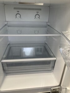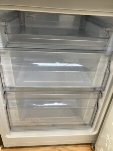 庫内は棚やケースが揃っており、破損もなく全体的に清潔感のある状態でした。一方で外装には、通常の擦れとは異なる拭き跡のようなムラが見られ、確認したところお客様が清掃された際に付いた可能性のある塗装剥がれに近い跡でした。また、正面パネルにはへこみも確認でき、外観評価に影響する状態でした。冷蔵・冷凍の冷却動作自体は問題ありませんでした。