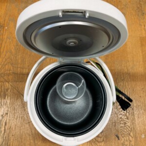 本体は外装下部や持ち手部分に軽度の汚れが見られましたが、割れや大きなへこみはなく、内釜のコーティングも保たれていました。付属の計量カップも揃っており、通電・炊飯の基本動作にも問題はありませんでした。全体として通常使用に支障のない状態と判断しました。