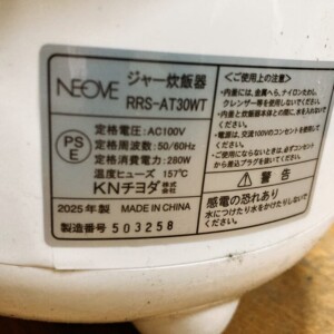 今回は四国中央市内の持ち家(一戸建て)にお住まいの50代男性・会社員のお客様より、NEOVE ジャー炊飯器 RRS-AT30WT(2025年製)を出張買取にてご依頼いただきました。ご夫婦世帯で日常的に使用されていた炊飯器とのことで、買い替えをきっかけに整理したいとのご相談でした。